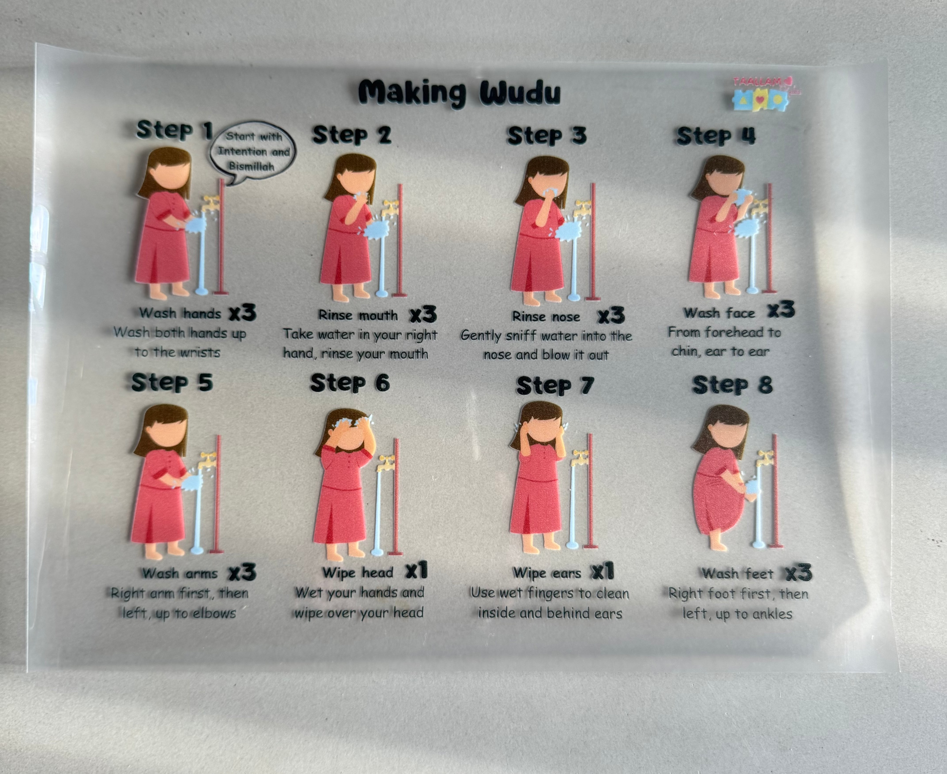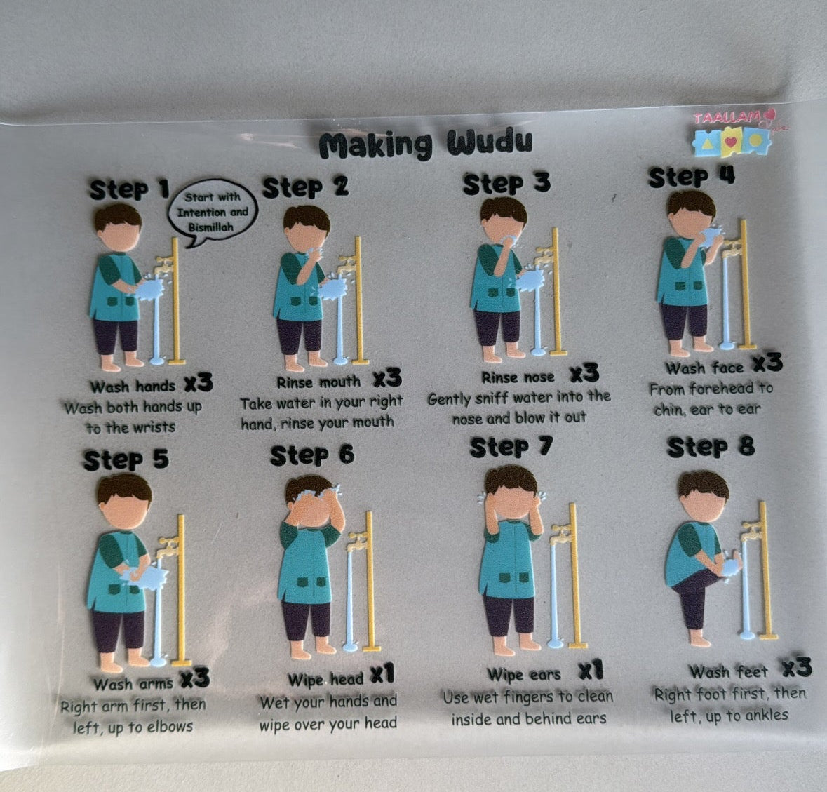 Wudu Making Sticker – A waterproof visual guide for making Wudu, perfect for placing on tiles, bathroom doors, or shower areas.